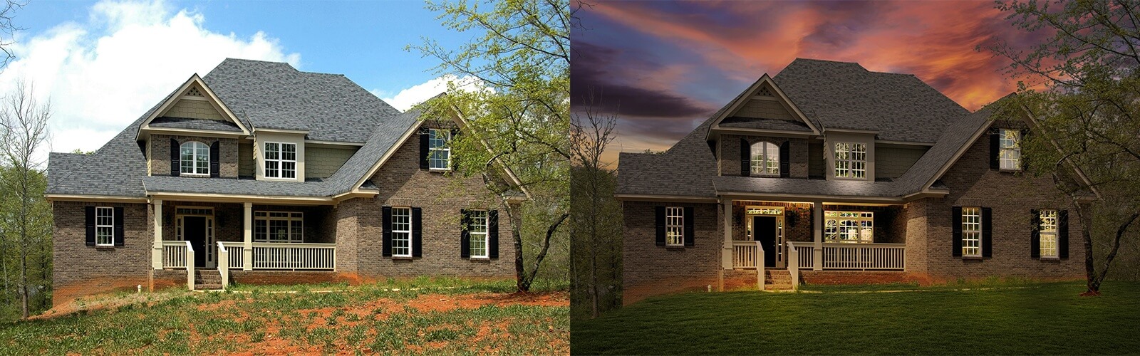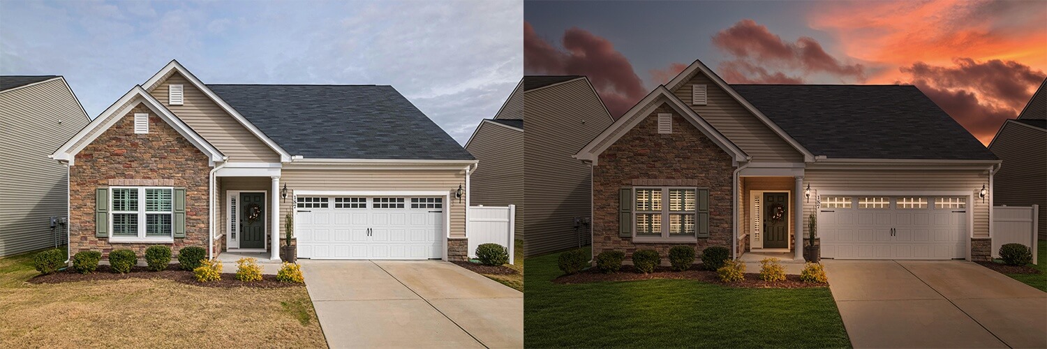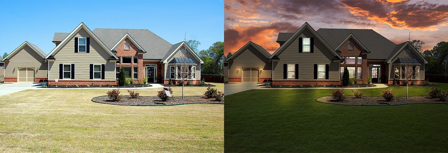 We can alter weather conditions by adding or removing clouds, rain, mists, snow, fog, the moon, stars, etc. to enhance the visual appeal of exterior real estate photos.